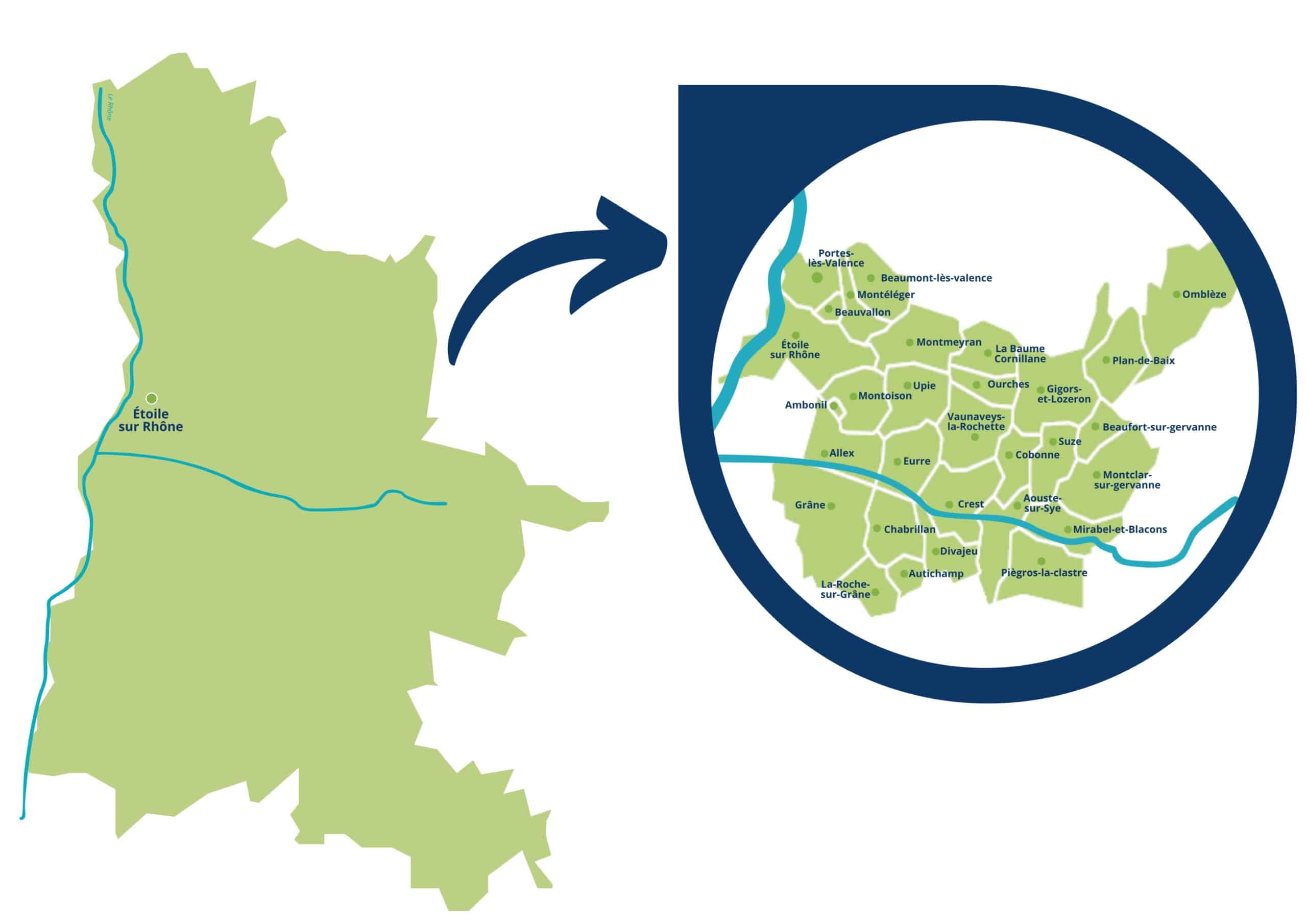 Secteur A : Allex I Ambonil I Beaumont-lès-Valence I Beauvallon I Étoile sur Rhône I Eurre I La Baume Cornillane I Montéléger I Montoison I Montmeyran I Ourches I Portes-lès-Valence I Upie.